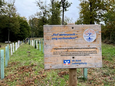 Bei der heimatverwurzelten VR-Bank Ludwigsburg eG, sind die Bemühungen für mehr Klimaschutz und Nachhaltigkeit wesentliche Bestandteile des Selbstverständnisses. Nachhaltiges – und damit soziales, ökonomisches und ökologisches – Denken und Handeln ist für uns kein Modetrend, sondern fester Bestandteil unserer strategischen Ausrichtung – aus Überzeugung und aus Respekt gegenüber zukünftigen Generationen. Als Zeichen unserer Verbundenheit und Treue zur Region pflanzen wir jedes Jahr gemeinsam mit unseren langjährigen Jubiläumsmitgliedern im Landkreis Ludwigsburg Bäume. „Die Mitgliedschaft in unserer Bank bedeutet Teilhabe an der Zukunftsgestaltung unserer Region. Das wissen wir in unserem Selbstverständnis als Förderer der regionalen Entwicklung zu schätzen. Dazu gehört auch das Thema Nachhaltigkeit. Deshalb stehen wir hier und bringen Setzlinge in die Erde“, betonte unser Vorstandsvorsitzender Timm Häberle bei der Pflanzaktion im Jahr 2025, bei der 200 neue Setzlinge eingesetzt wurden. Unsere Initiative hat bereits eine langjährige Tradition: Seit 2011 konnten wir auf diese Weise rund 3.300 junge Bäume im Landkreis Ludwigsburg pflanzen – ein Engagement, das wir aus Überzeugung und in Verantwortung gegenüber kommenden Generationen fortführen. Unsere Mitgliederehrung und unser Engagement für den Erhalt des Waldbestands sind das ganze Jahr über durch eine entsprechende Beschilderung vor Ort für Besucherinnen, Besucher und Spaziergänger sichtbar.